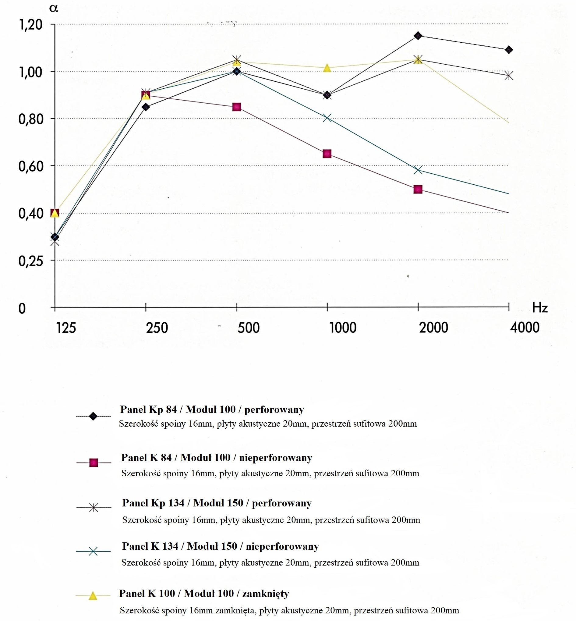 Krzywa 1: Panel typu K134, nieperforowany, moduł 150 mm, szerokość spoiny 16 mm, z płytami z wełny mineralnej o grubości 20 mm, szczelina stropowa 20 cm.